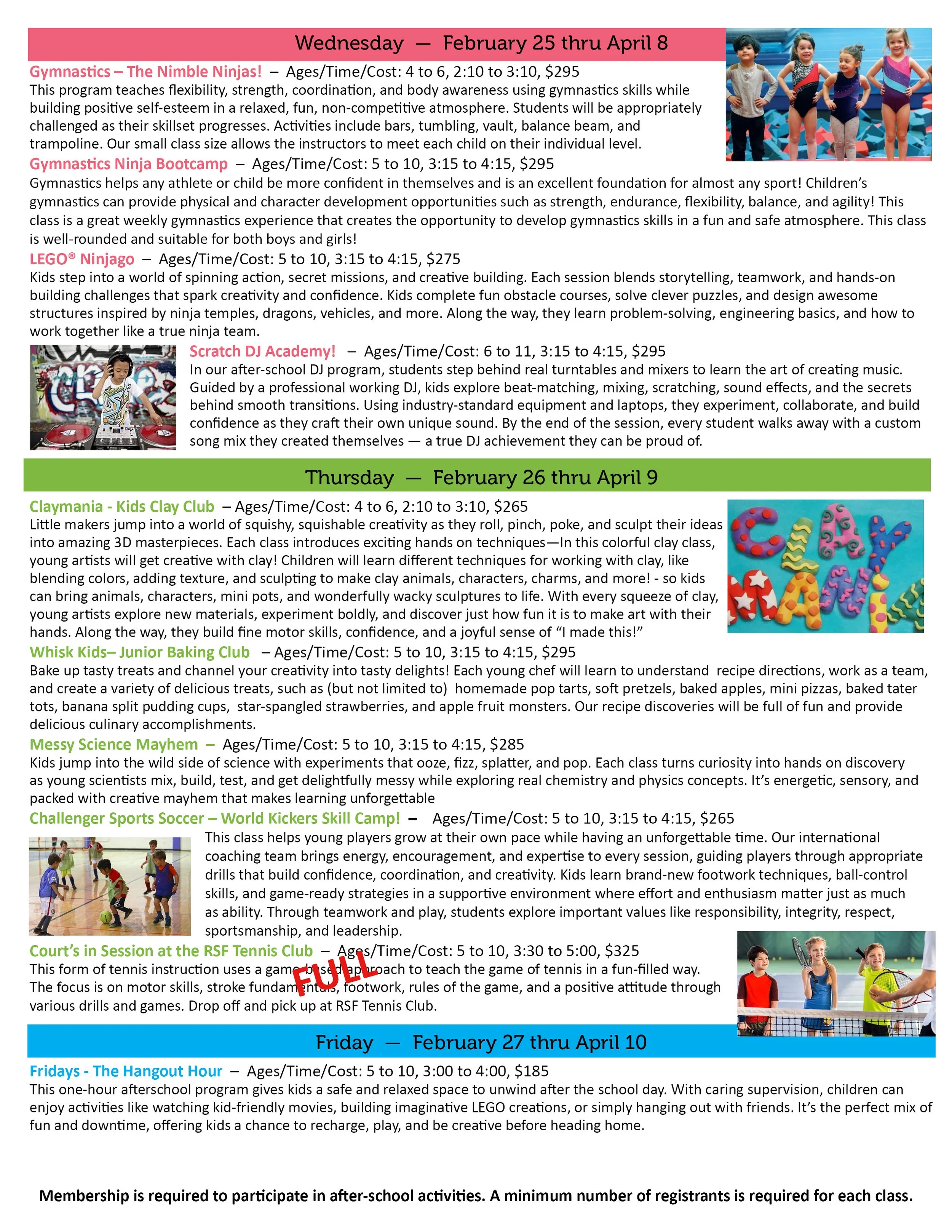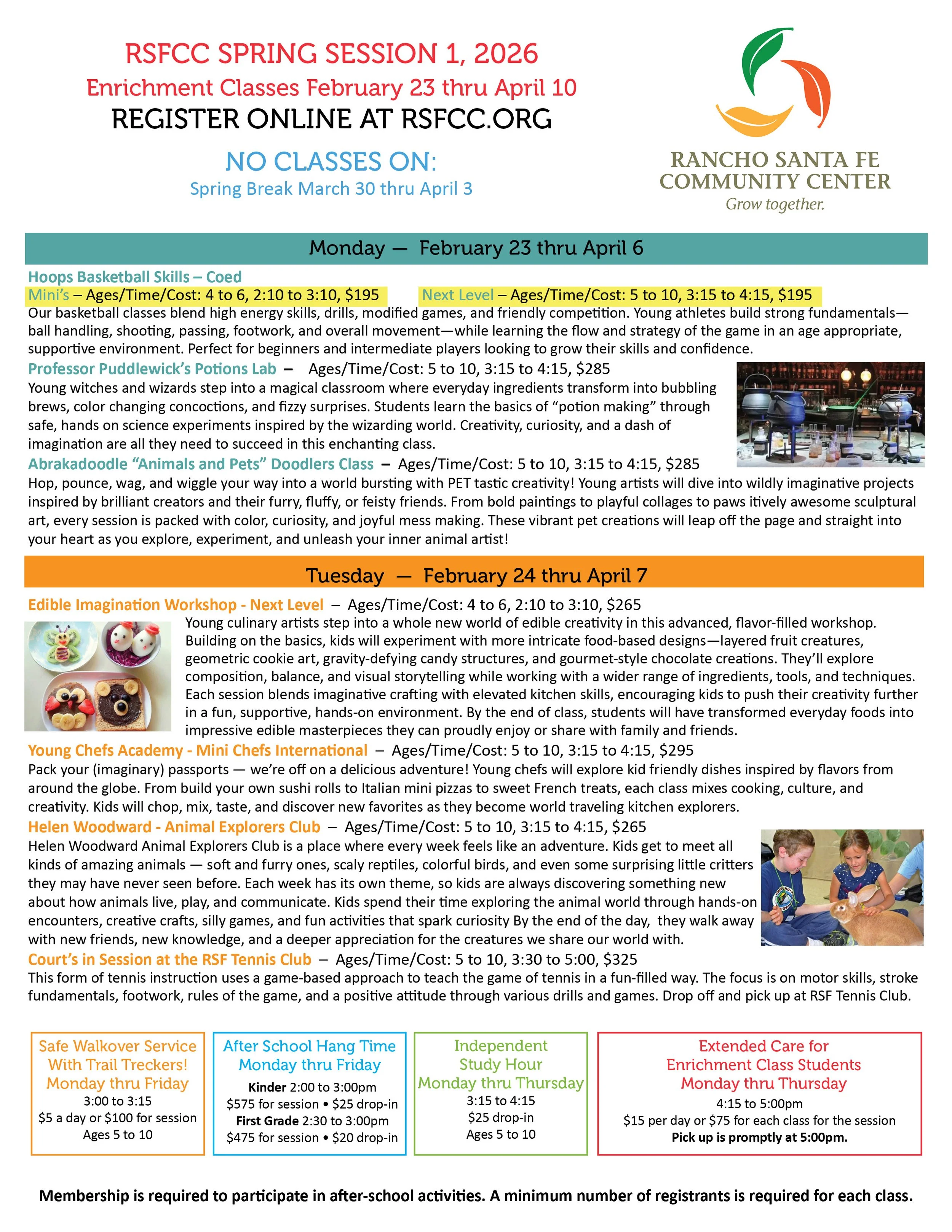 SPRING SESSION 1 CLASSES ARE OPEN! REGISTER HERE! CHECK OUT THE AFTERSCHOOL HANGTIME PROGRAM HERE DOWNLOAD SUMMARY FLYER HERE DOWNLOAD DETAILED FLYER HERE